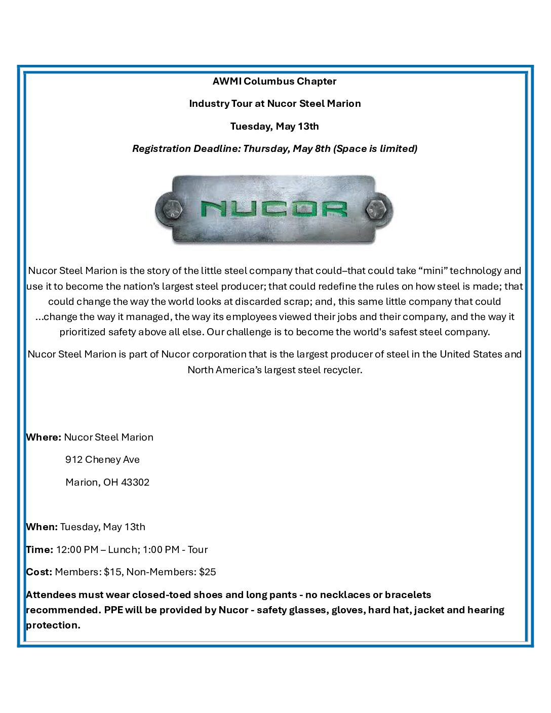 AWMI Chicago Industry Dinner Keynote Speaker: Dan Brown Senior Vice President – Advanced Technology Steelmaking – U. S. Steel Chief Operating Officer – Big River Steel Works REGISTER HERE Pricing: Member: $200 Corporate Member: $225 Non-Member: $250 Please RSVP by Monday, May 19, 2025 to secure your spot. We can’t wait to see you […]