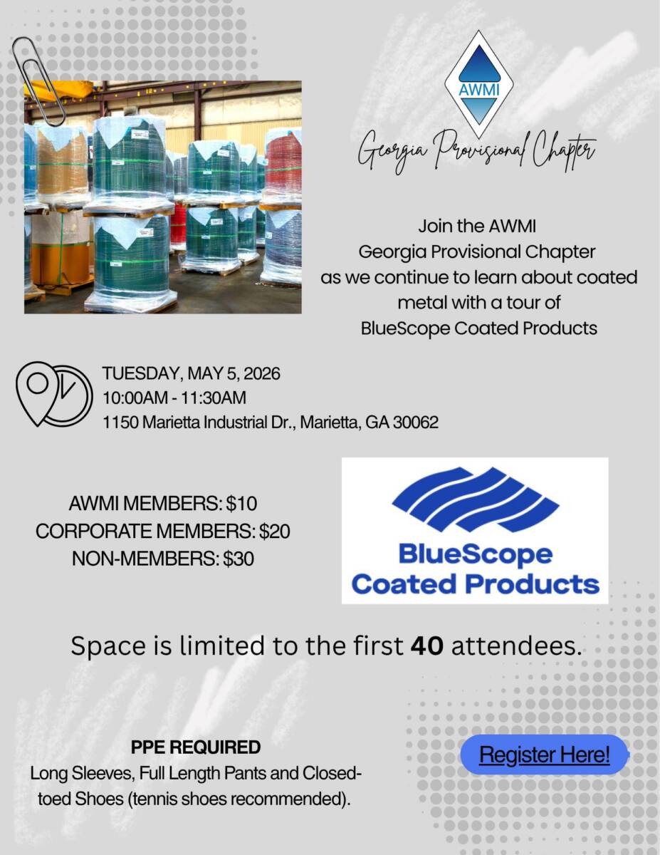 Join AWMI Georgia Provisional Chapter for a tour of BlueScope Coated Products. Tuesday, May 5, 2026 10:00AM – 11:30 AM EST 1150 Marietta Industrial Dr., Marietta, GA 30062 AWMI Members: $10 Corporate Member: $20 Non-Member: $30 Register here: https://square.link/u/CDxfbkyw Hope to see you there! |