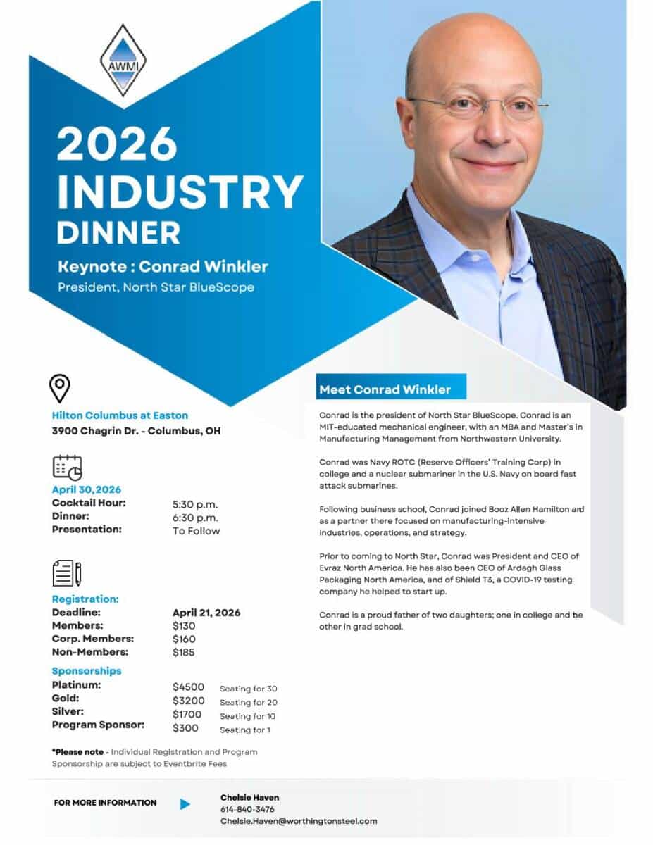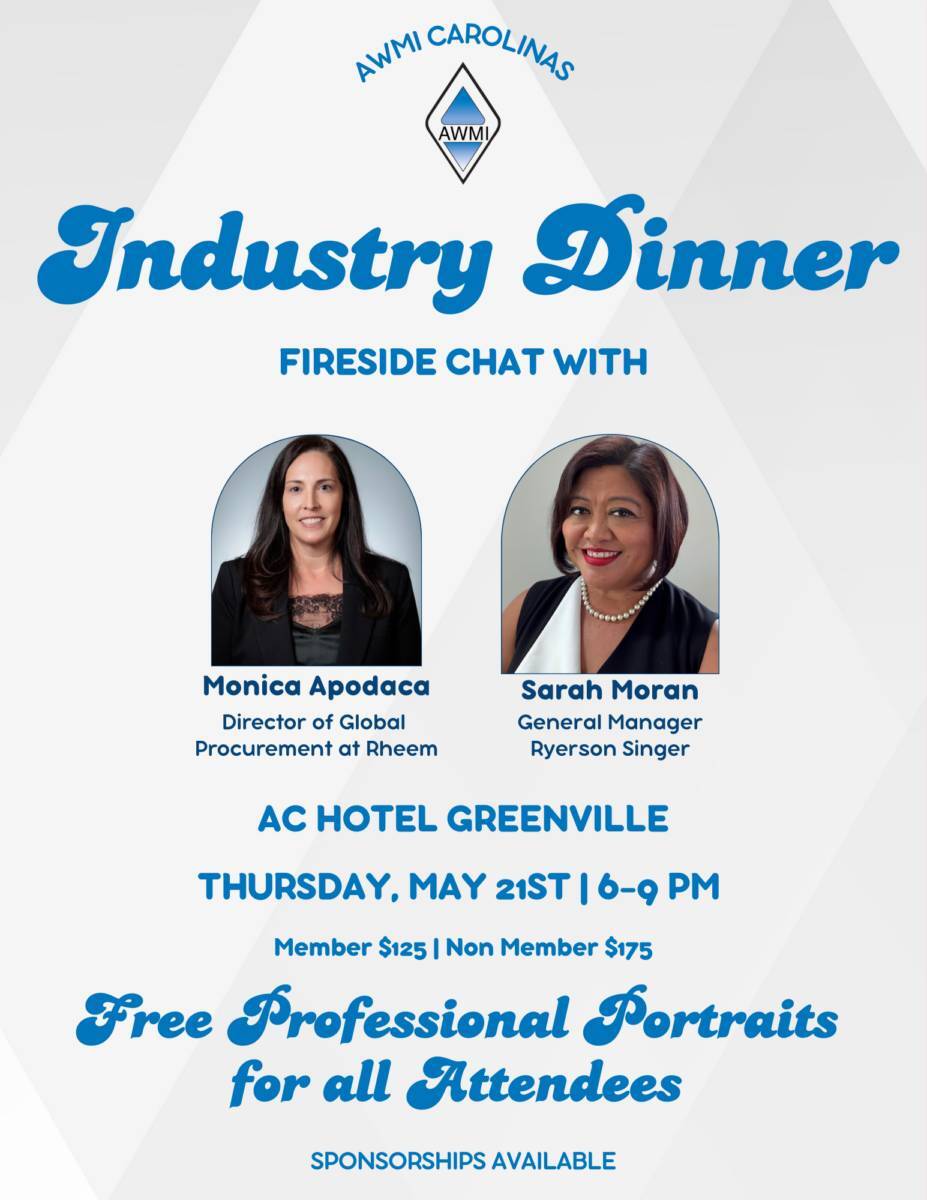 AWMI Carolinas 2026 Industry Dinner & Fireside Chat Featuring Monica Apodaca, Director of Global Procurement at Rheem Sarah Moran, General Manager at Ryerson Singer 📅 Date: Thursday, May 21st ⏰ Time: Cocktail Hour 6 – 7 PM | Dinner 7 – 9 PM 📍 Location: AC Hotel Downtown Greenville Rooftop 315 S Main St, Greenville, […] |